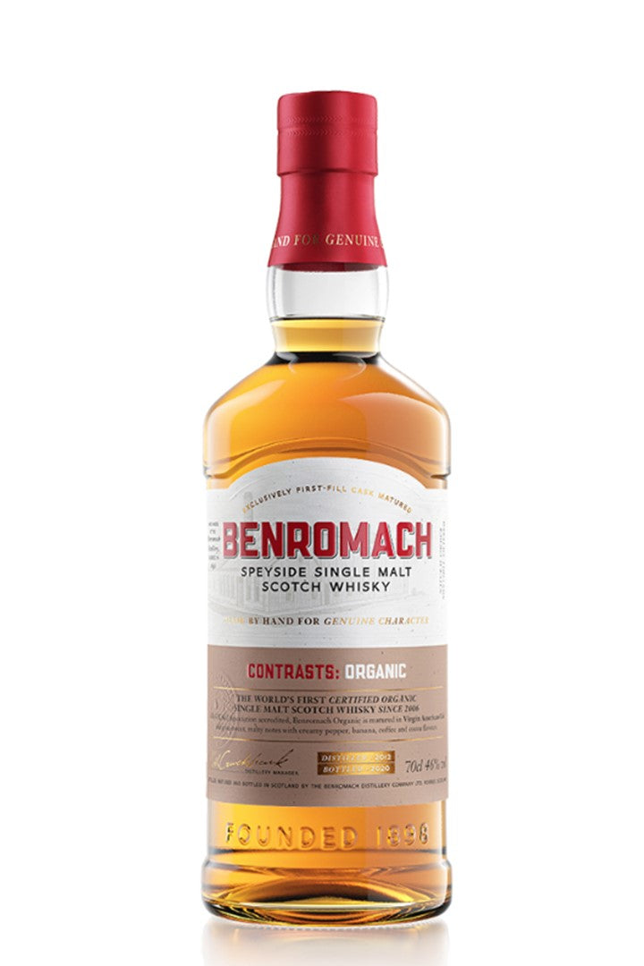 Benromach Contrasts Organic er verdens første certificerede økologiske single malt whisky siden 1996! I modsætning til den sædvanlige husstil, er der ingen røg i denne aftapning. Til gengæld giver lagringen i tønder af Virgin American Oak søde maltnoter med cremet peber, banan, kaffe og kakaosmag